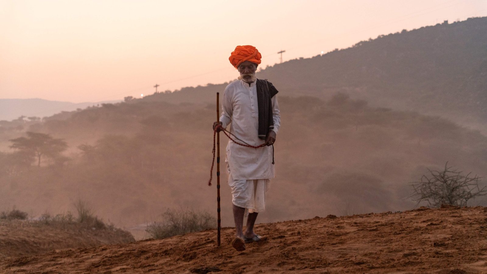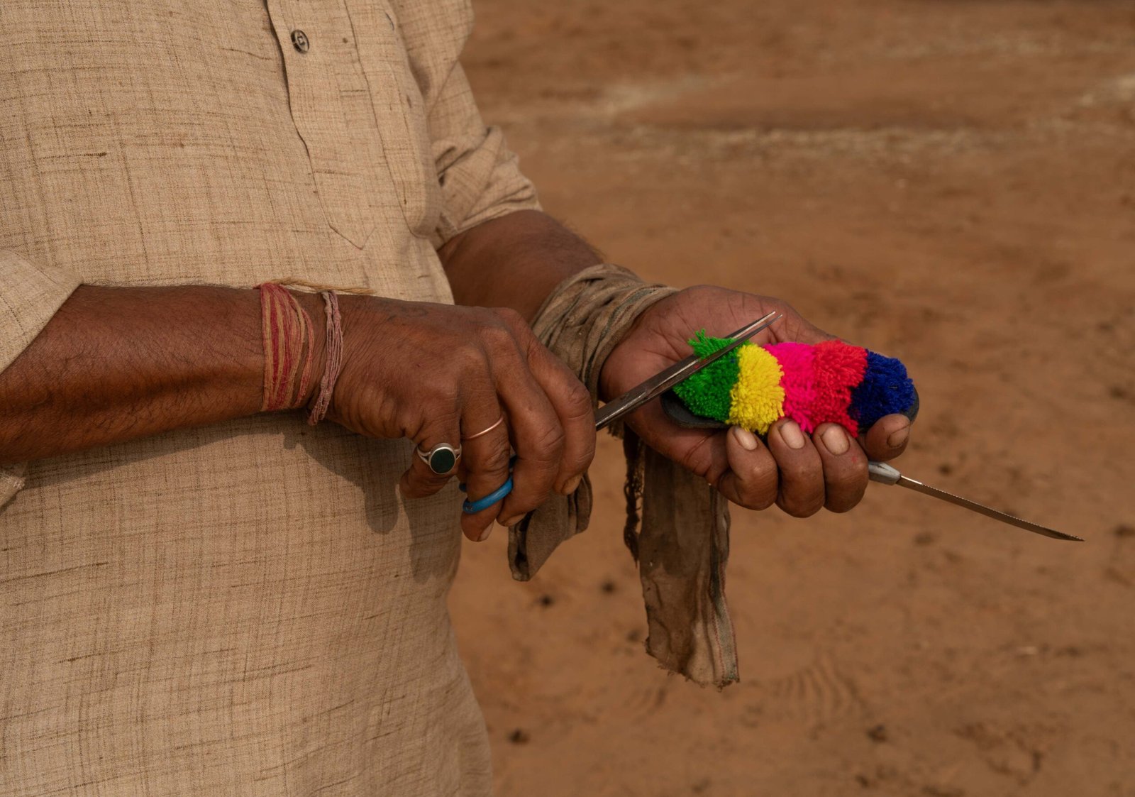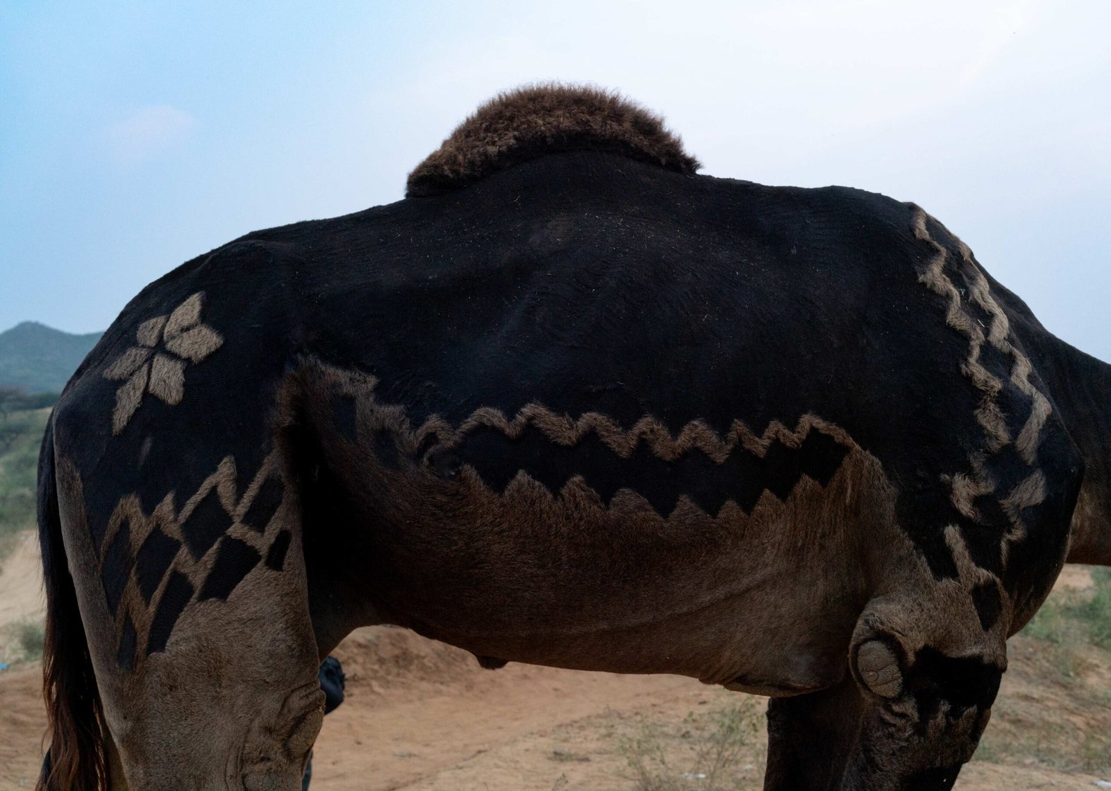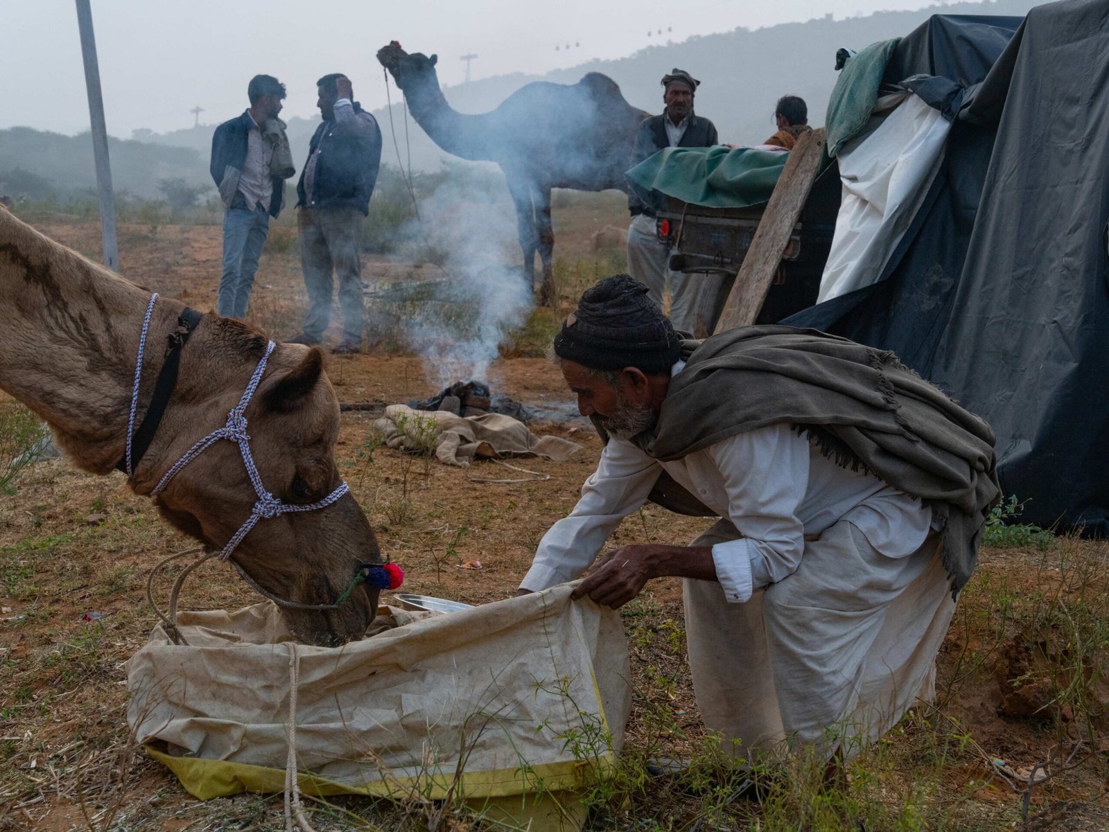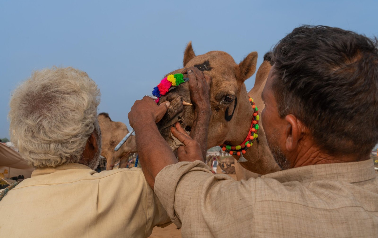 The whole place rapidly came alive with each passing hour. More traders gathered and started their daily routine of preparing the camels. At first they unloaded a sack of dry grass and grains on the sand, carts, and on other sacks for the camels to eat. While the camels were busy consuming their first meal, the traders brushed their fur coat with bundles of hay to aid them in shedding or to rub off insects and allow them to spend some bonding time. After the grooming session, they were adorned with sequins, bells and beaded necklaces across their necks. Colourful cloth balls were used to embellish few nose rings for the camels, which added to the decorations. Several artisans meticulously shaved and trimmed the camels’ fur into complex designs such as geometric patterns, floral motifs and even narrative scenes. Sometimes the camels were given a special medicine to maintain their health. It was also evident by the fact that animal health care trucks were present at all times. These activities had the main purpose of showing off the camels’ health and beauty to potential buyers. Several local farmers flooded the area to buy, sell and barter livestock. The herders themselves dressed in traditional attire with vibrant turbans (dastar), loose white Angrakha kurta, and dhoti. Their faces brimmed with confidence and honour as they proudly presented their prized possession of livestock and welcomed the opportunities.