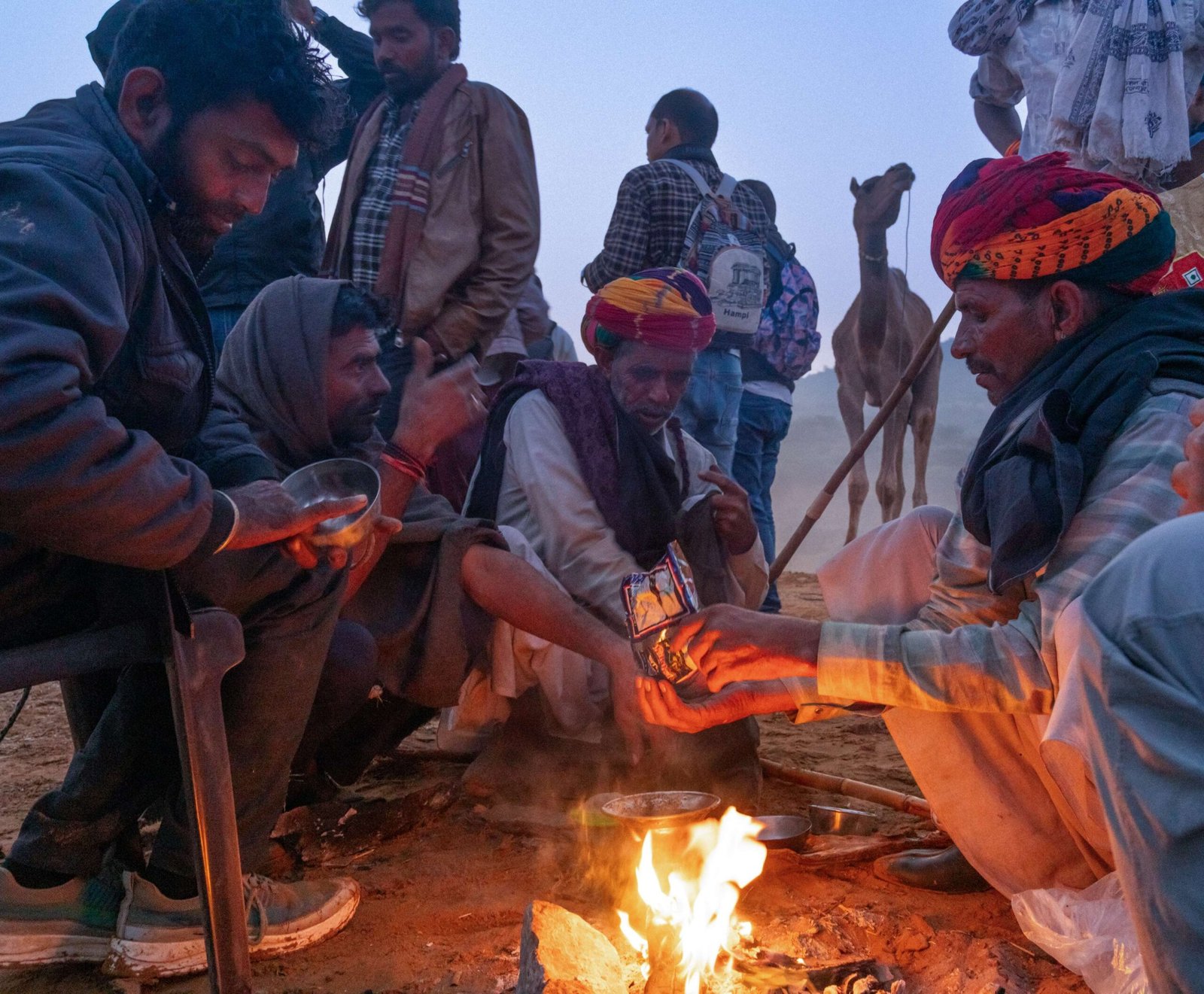 When the day began preparing its last rites, when the tide of eager buyers started to die down, the place again filled with a complacent weariness. In the vast, churning space where the camels had been tethered, silence was gaining purchase. The men, their faces etched with the dust were banking the day’s earnings. The camels and the horses were guided away from the fair ground, their heavy, soft pads crunching across the drying earth, leaving only the smell of warm wool and trampled fodder behind. As the golden rays bled into deep terracotta and ash-rose along the western ridge, smoke began to rise at the edge of the stretched horizon. Campfires for warmth and brick stoves for food. Villagers, wrapped in chequered shawls, flocked around the fire and hunched over like moths around hanging light bulbs. I could hear the sound of metal bowls being struck and the steady, rhythmic scrape of sugar being dissolved. Ghee sizzled; a rich, intoxicating scent of deep-fried syrup soaked pancakes (Malpua) and strong, spiced tea spread, a communal signal that the work was over and the ritual of dinner had begun. Sitting on a rock, feeling the baked winds of fire and sipping on hot tea, I looked up. The vast emptiness over my head had changed into a deep blue gown with a tinge of retreating inky velvet. Thousands of pinpricks like hanging chandeliers scattered across the sky. I felt, in a similar night like this, hundreds of years ago, nomads and villagers and so many people might have traversed this empty desert land with nothing but the curse of freedom and a map of star-studded sky.