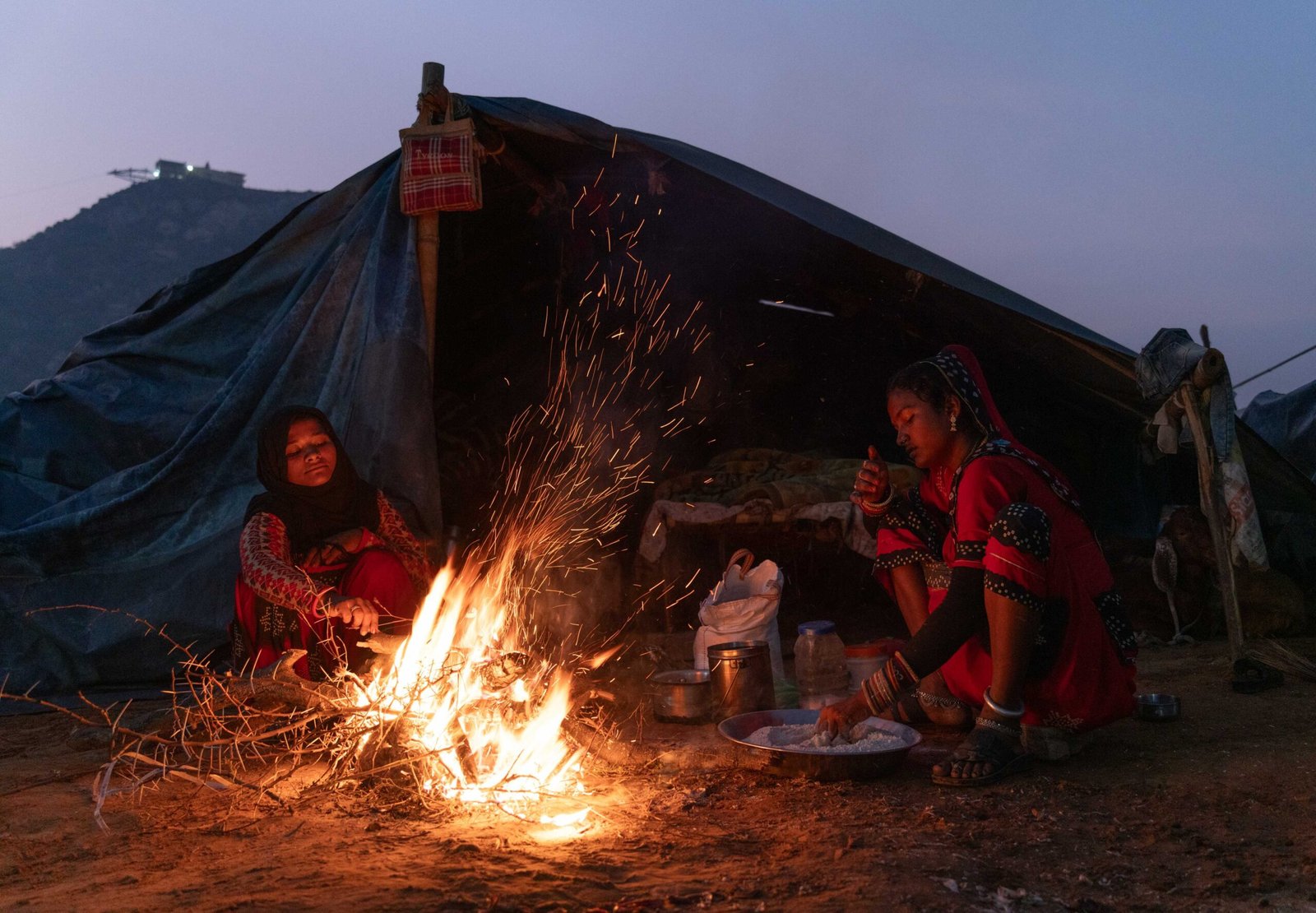 Gradually the eastern part of the sky bathed in the first blush of rose and unveiled the rising, molten gold. Beyond the resting gentle giants, there were small tents scattered across the desert ground. They looked like a family of dwarves sleeping with their pointy hats on. In front of some tents, cooking fires glowed through lavender dust. Few women were baking bread for the day ahead. Their ornaments scintillating with the flames. Distant voices of some herders passed by my ears as they plodded on towards a group of recently awakened camels. The wind had picked up its speed, blowing shimmering dust across the plain.